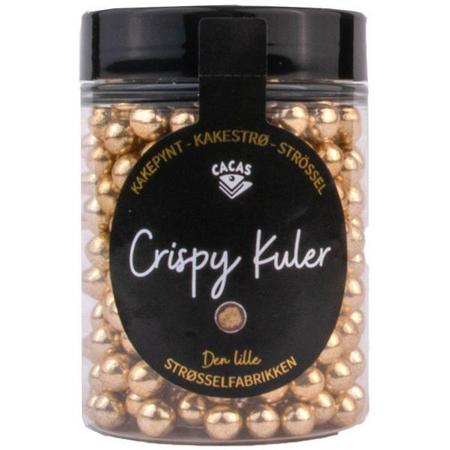Cacas – Crispy kuler er små, dekorative kuler laget av sjokolade eller sukkermasse, ment for å brukes til pynt på kaker, cupcakes og andre bakverk. De har en diameter på 6 mm og er belagt med en gullfarget overflate som gir et elegant og festlig utseende.