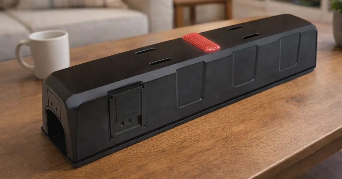 Dette er en musefelleboks designet med to smekk-feller og en innebygd alarmfunksjon for å varsle om fangst. Når en mus trår inn i en av fellene, utløses både en lyd- og et lyssignal, noe som gjør det enkelt å oppdage når fangsten er fullført.